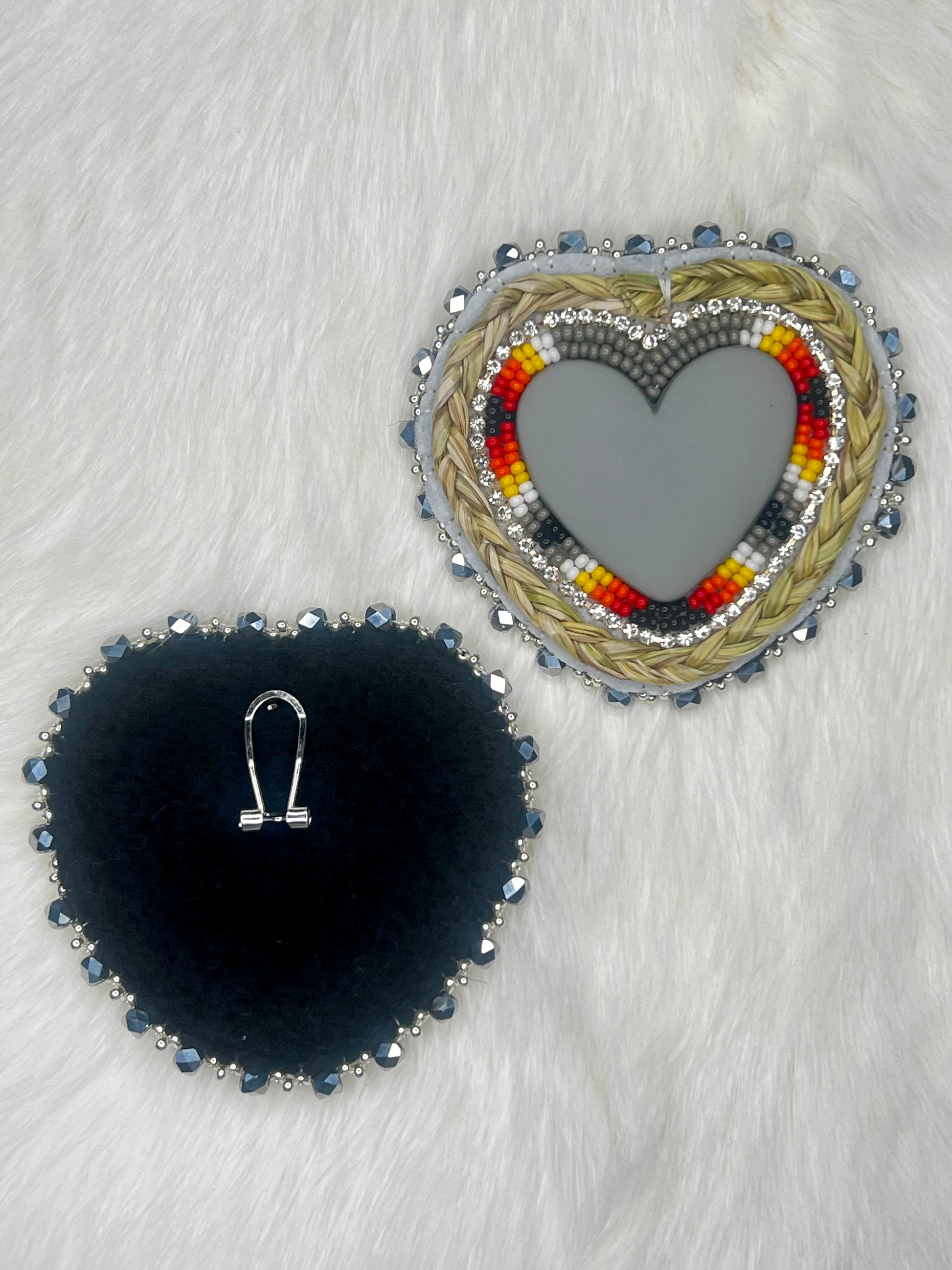 Grey heart centers featuring black, red, orange, yellow, white and grey beads. Accented with crystal rhinestone banding, metallic bicone beads and braided sweetgrass. Finished with black felt backing and silver plated fingernail posts.