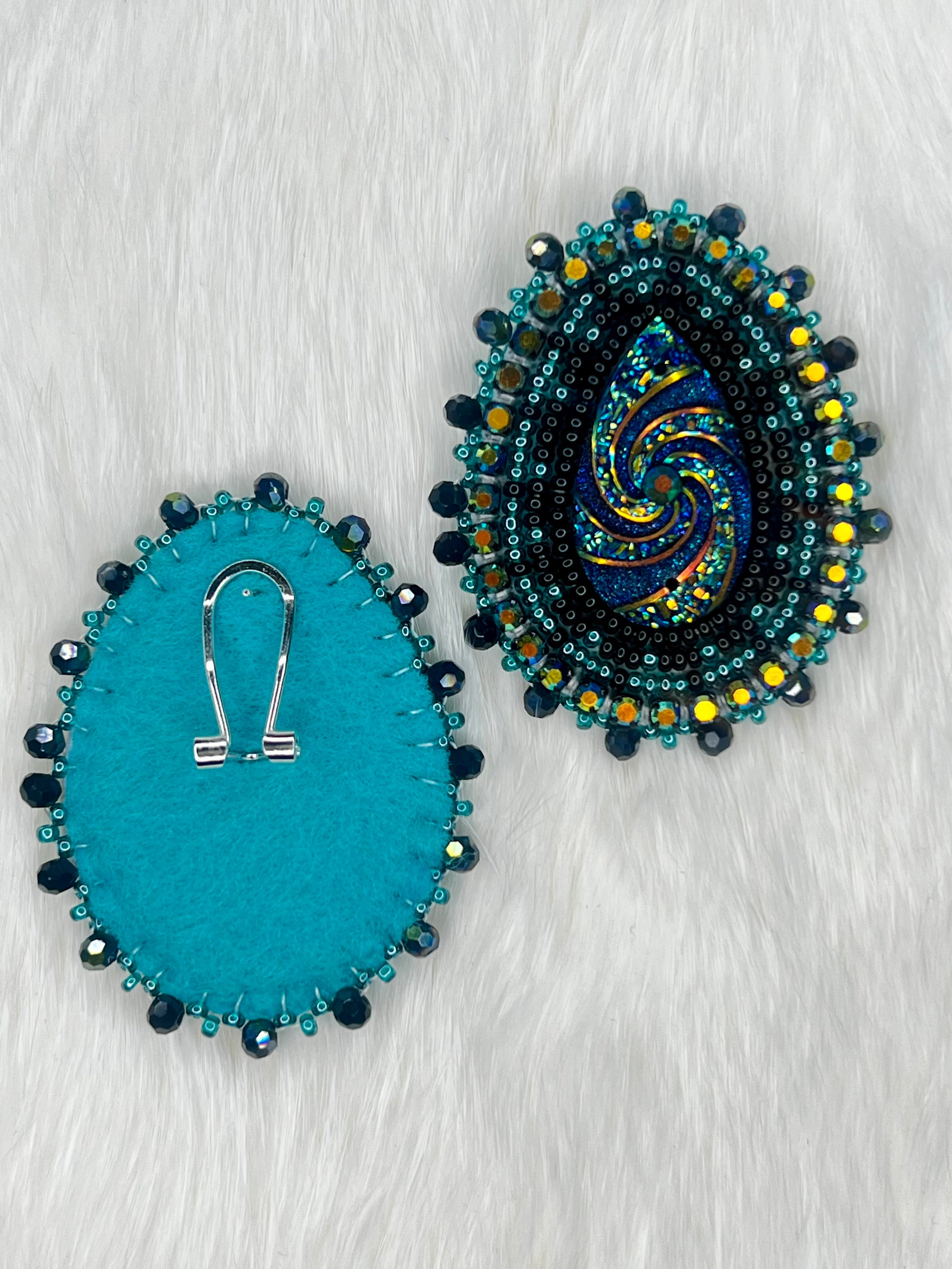 Black and blue swirl teardrop centres featuring black and teal beads. Accented with northern lights rhinestone chain and black iridescent bicone beads. Finished with teal felt backing and silver plated fingernail posts.