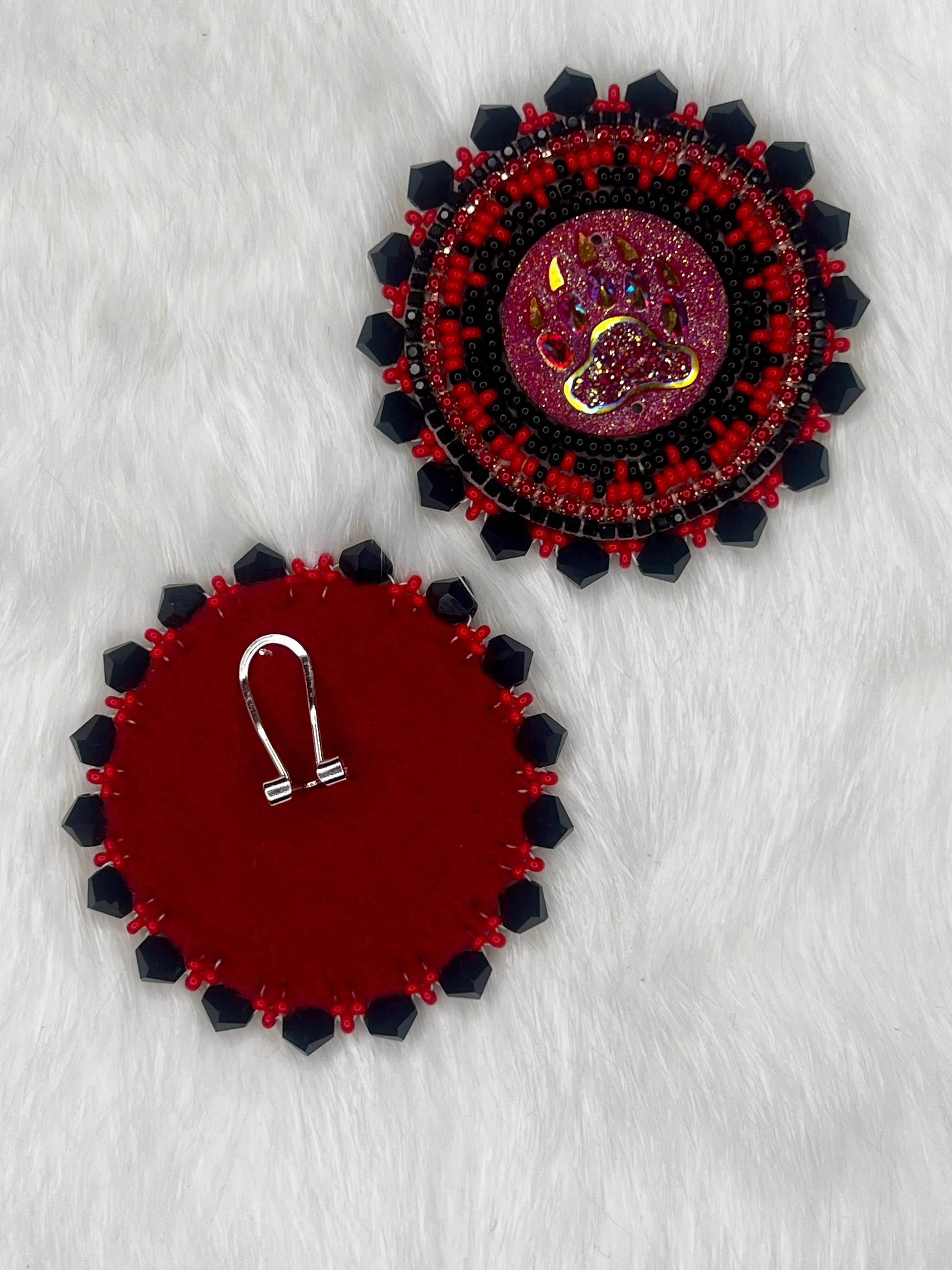 Red bear paw centres featuring black and red beads. Accented with red pearl, black rhinestone banding and black bicone beads. Finished with red felt and silver plated fingernail posts.