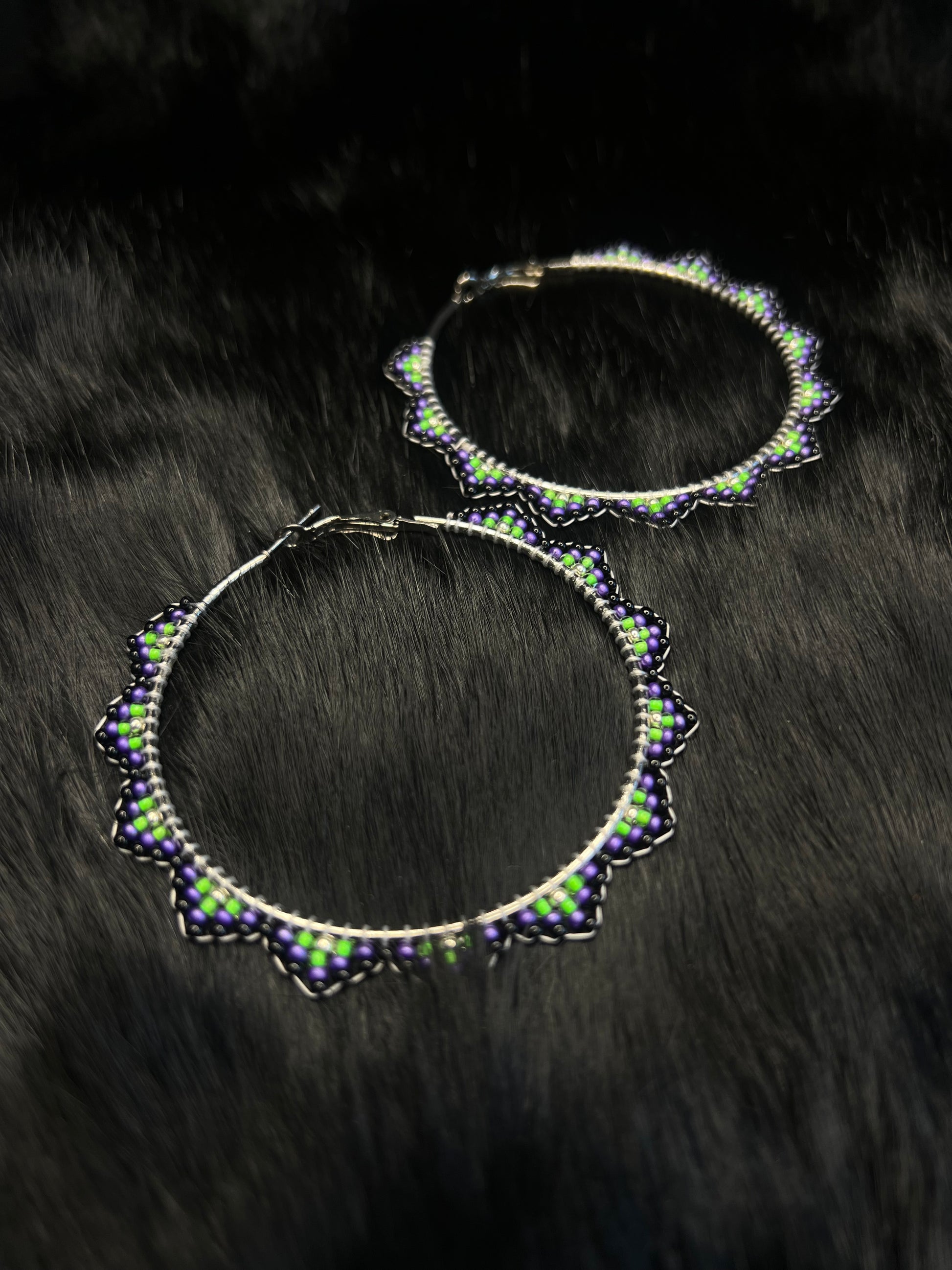 Silver earring hoops featuring black, purple, neon green and silver beads.