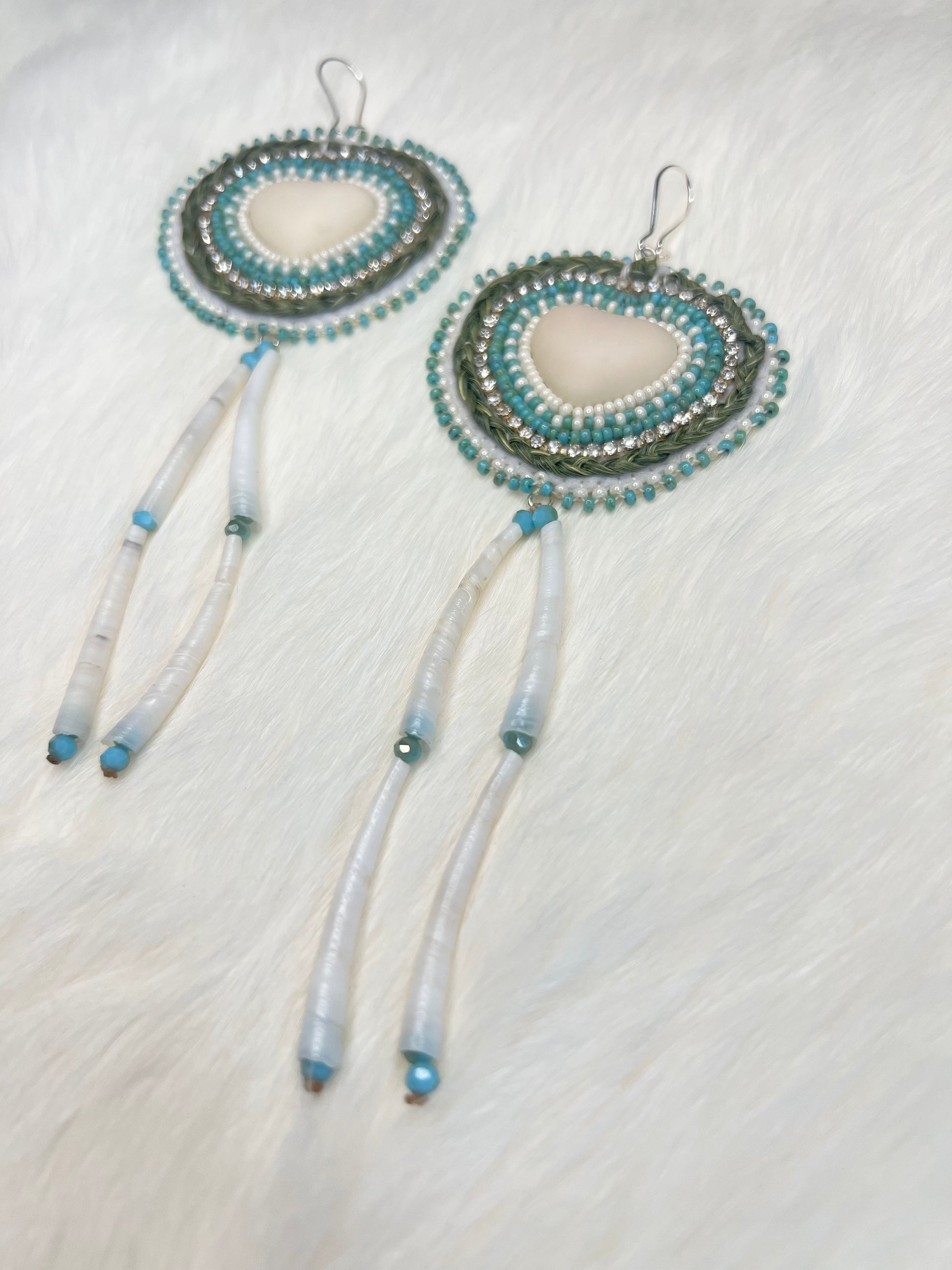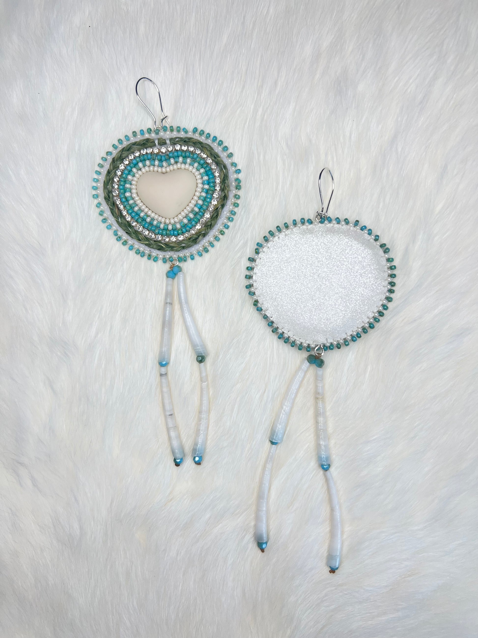 Cream heart centers featuring pearl and turquoise beads. Accented with crystal rhinestone banding, turquoise bicone beads, braided sweetgrass and dentalium shells. Finished with sparkly white leatherette backing and silver rounded kidney ear wire.