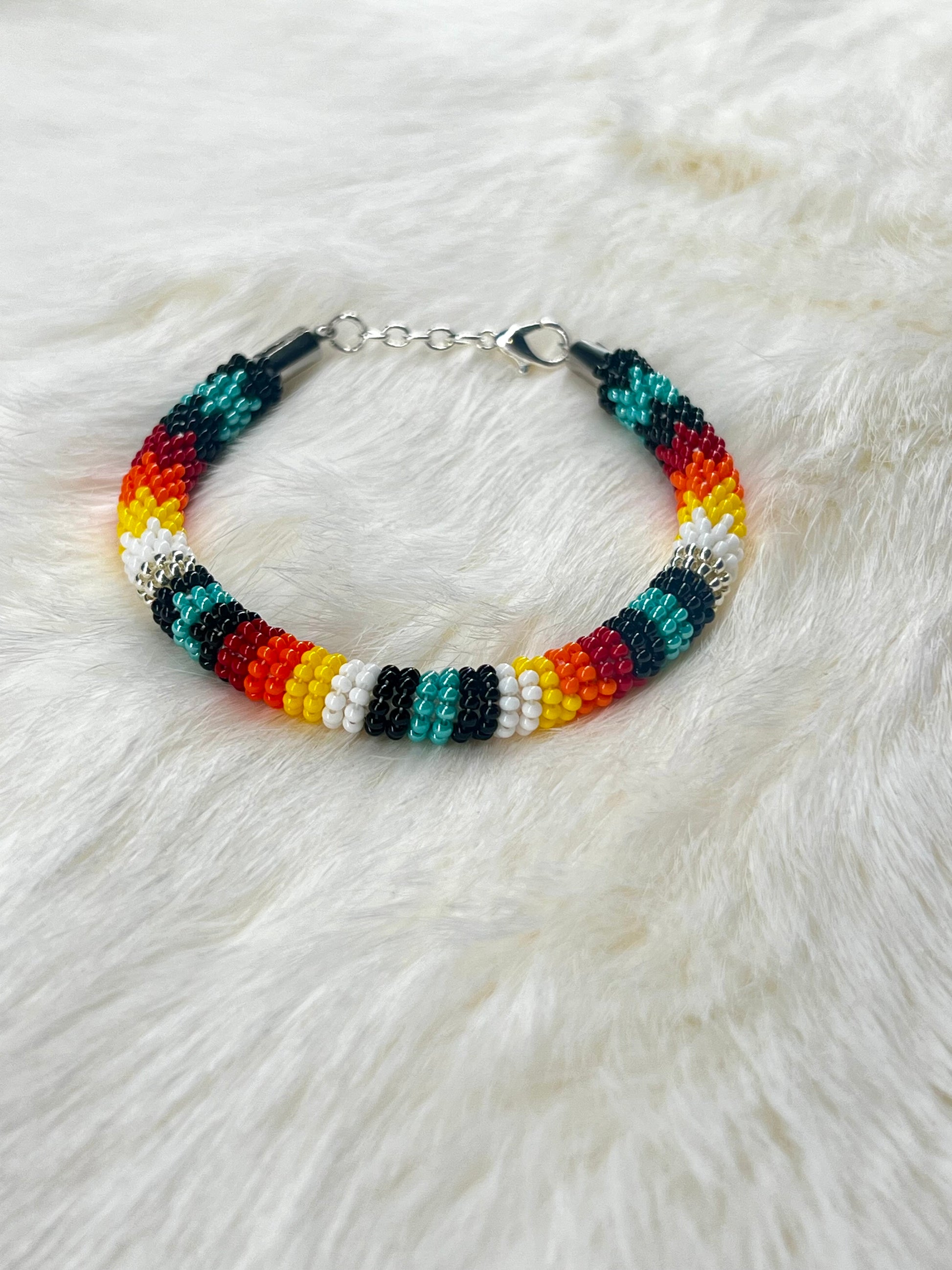 Beaded bracelet featuring black, white, yellow, orange, yellow, turquoise and silver beads. Finished with stainless steel/silver hardware.