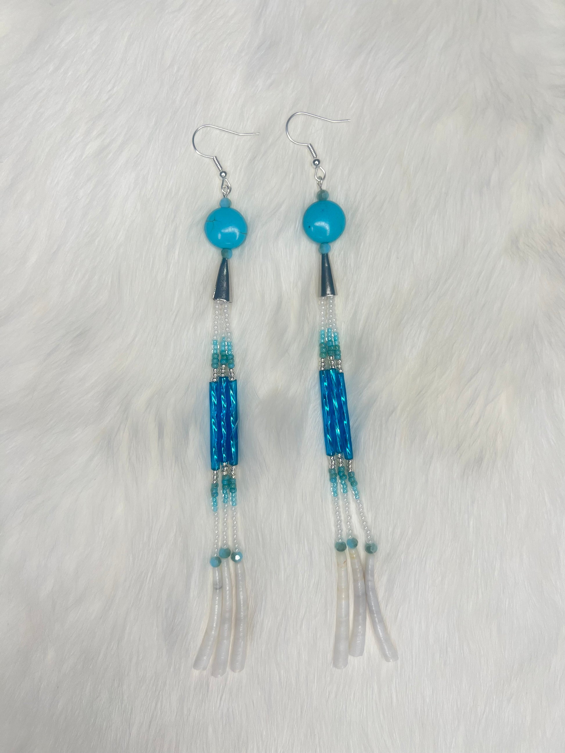 Turquoise Dangles featuring turquoise, pearl, and silver beads. Accented with dentalium shells, blue swirl bugle beads and turquoise bicone beads. Finished with silver-plated earring hooks. Length measured at 6 inches.